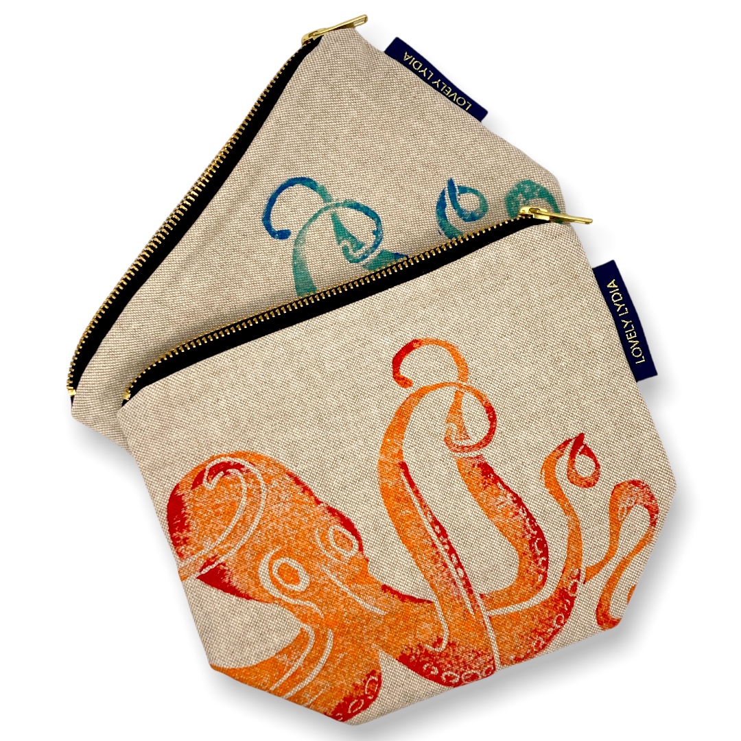 Exclusive to Mutiny Shaving – Beautiful, handmade, unisex washbag created from natural cotton, with a waterproof inner lining. creating in collaboration with the fantastic Lovely Lydia. Hand drawn and water based printed Octopus design in orange or blue, with gold zip and waxed olive green & gold inner.